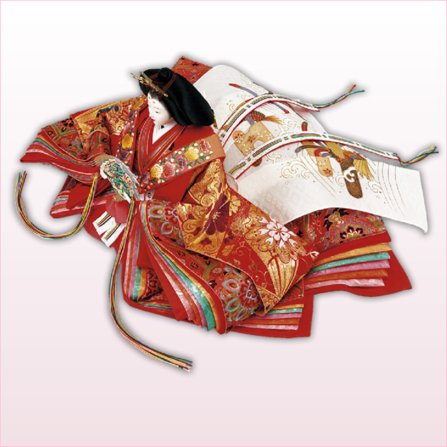 巾135×高179cmのボリュームのあるサイズの飾り台に、特上金襴十二単衣裳の上品なおひなさまが平安優美な雰囲気を醸し出します。