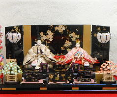 「久遊作」正絹衣装の親王揃いと四曲桜金彩蒔絵屏風飾台と組合せた平飾りです。