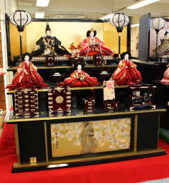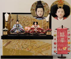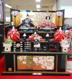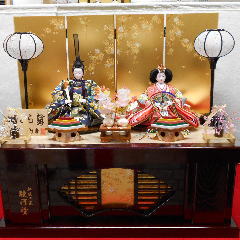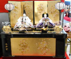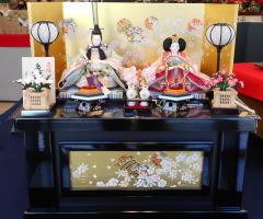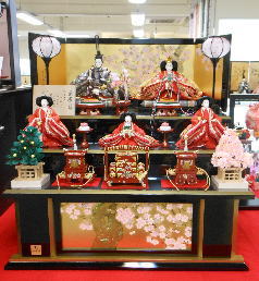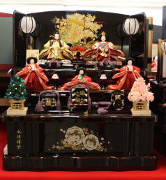 小十番金彩親王揃いを溜塗の収納飾り台と組み合わされました。当店では一番大きな収納飾りです。