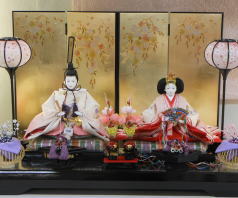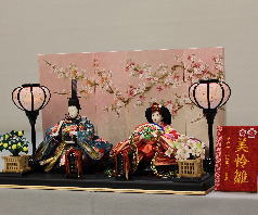 有松陽寿作「令春雛」木目込み親王揃いを桜華蒔絵を施した木製屏風飾台と組み合わされました。