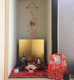 松寿作おぼこ立雛を金沢箔二曲屏風と組み合わされました。