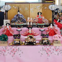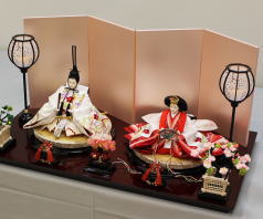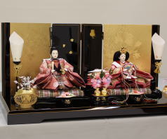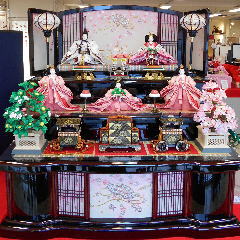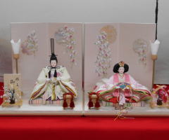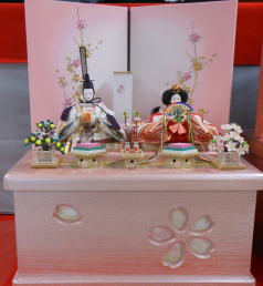 桜刺繍を施した親王揃いをパールピンクの三段に組み合わされました。今年はピンク系の屏風飾台を選ばれる方が例年より多いようです。