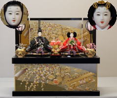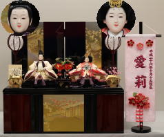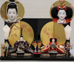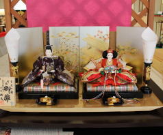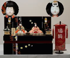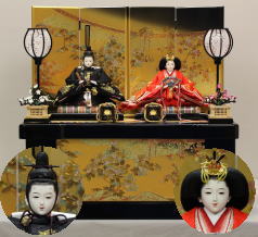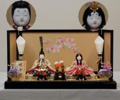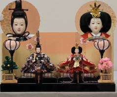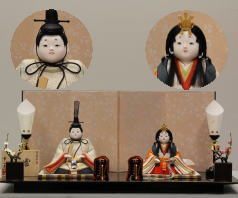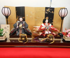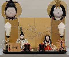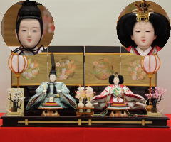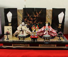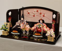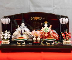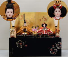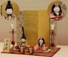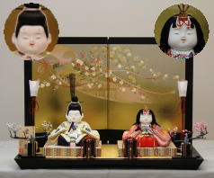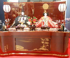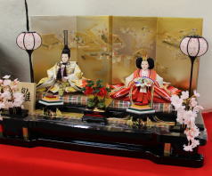 「草園作」親王揃いを溜塗四君子蒔絵屏風飾台と組合せた平飾りです。