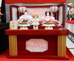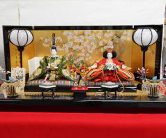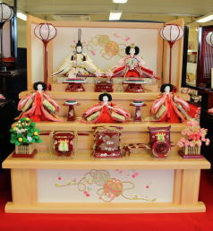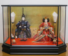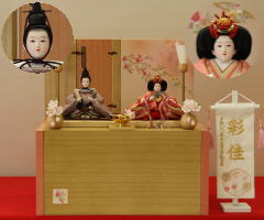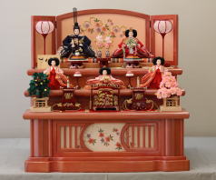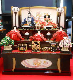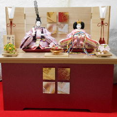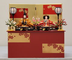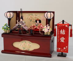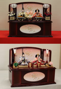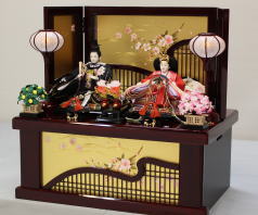 草園作親王揃いを箔ちらしのレリーフを配した木調と赤艶消し塗装の屏風付き収納飾りと組み合わされました。