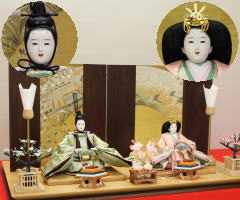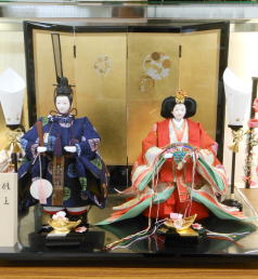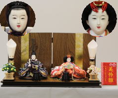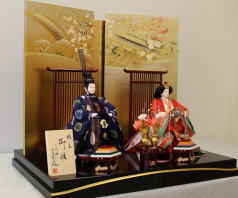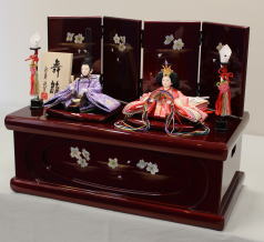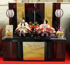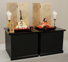 芙紗彦作親王揃いと金彩蒔絵を施した会津塗屏風収納飾台と組合せた収納飾りです。