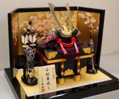 「慧」紫裾濃縅兜と手描き桜蒔絵二曲屏風を組合せた平飾りです。