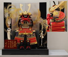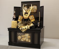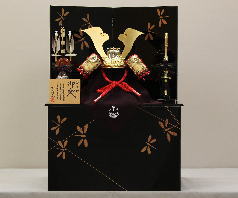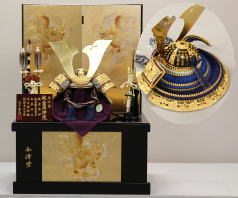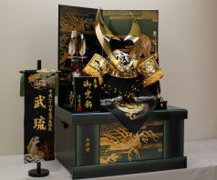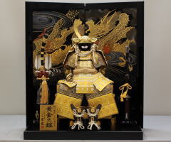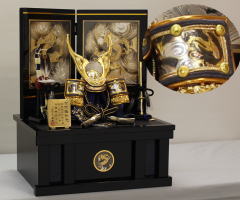鍬形、吹き返し、袱紗そして屏風台に龍彫金をあしらった豪華な収納飾りです。