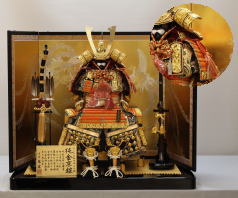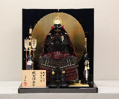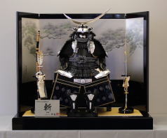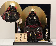 織田信長鎧と黒塗に丸く金沢箔をはめ込んだ二曲屏風と組合せた平飾りです。