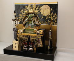 緑段縅の鎧と鶴と月の金彩を施した屏風と組合せた平飾りです。