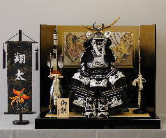 シルバーの伊達政宗鎧を銀箔に松の金彩を施した屏風と組み合わせた平飾りです。