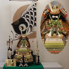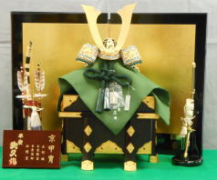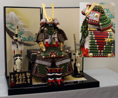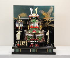 緑段縅鎧を手描きタペストリーと組合わせた平飾りです。
