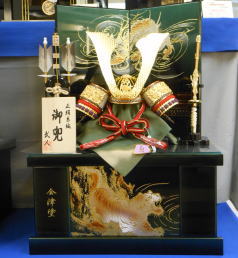 同じ会津塗りでグリーン暈し龍虎蒔絵の屏風飾台です。兜は先程と同じ兜を選ばれました。