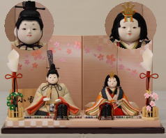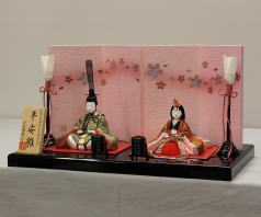 有松陽寿作「平安雛」を和紙に桜金彩を施した屏風と組合せたコンパクトな木目込み飾りです。