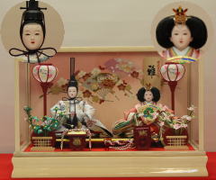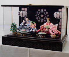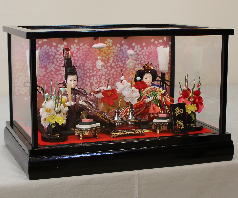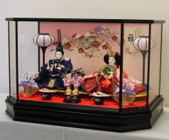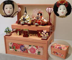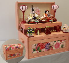 真多呂作「春花雛」をキューブ型収納台と組合せた木目込み収納飾りです。