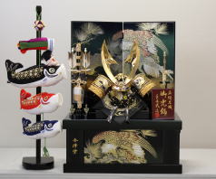 幸一光作鎧着大将「愛」を鯉のぼりとアヤメの刺繍を施した屏風台飾り台と組合わせた平飾りです。