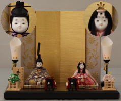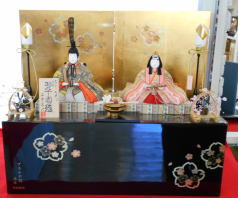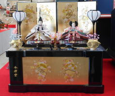 先ほどと同じ立雛ですが会津塗りで金沢箔に花丸の蒔絵を施した四曲屏風と組み合わされました。