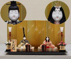 柿沼東光作「娟秀雛」を金彩群鶴蒔絵屏風と組合せた木目込み平飾りです。