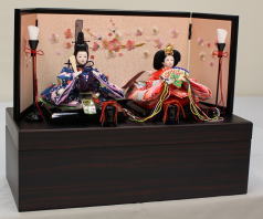 西陣織物衣装の親王揃いをワイン塗毬と紐柄の刺繍を施した屏風付収納箱と組合せたセットです。