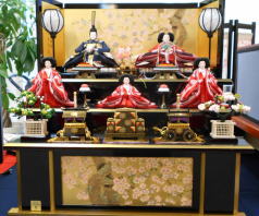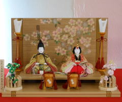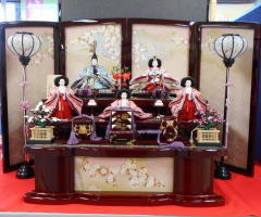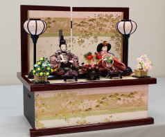 桜刺繍親王揃いをタモ材使用の月桜蒔絵屏風飾台と組み合わされました。