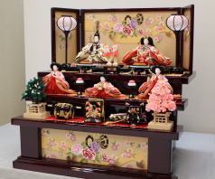 三段を飾るスペースは無いけど三人官女は欲しいとの事でお人形を少し小振りにして平飾台と組み合わされました。
