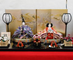 同じ紫ボカシ刺繍二曲屏風ですが中央に一本の行灯を立て、桜刺繍の親王揃いと組み合わされました。
