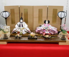 「田村芙紗彦作」正絹帯地親王揃いをピンク裏箔四曲屏風、木目飾台と組合せた平飾りです。
