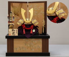 白萌黄段縅伊達兜を青海波金襴を配した木目屏風と組合せた収納飾りです。