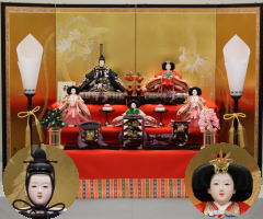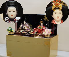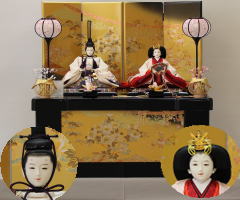 「草園作」親王揃いを金彩レリーフを配した屏風付収納箱と組合せたセットです。