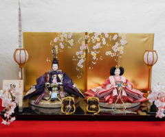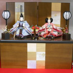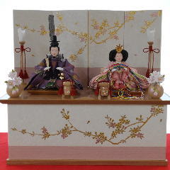 柳サイズの親王揃いと枝桜金彩蒔絵を施した屏風収納台を使い薄い紫系統の色合いで組み合わされました。