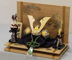 紺裾濃縅兜とバーチとウォールナットの屏風飾台と組合わせたコンパクトな平飾りです。