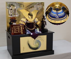 綺麗なブルーの鎧がご希望で前立をシルバーの徳川家康仕様にし、これに合せて丸型銀箔屏風で組み合わされました。
