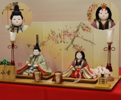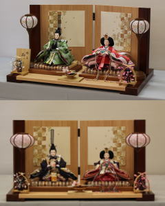 「草園作」親王揃いを桜金彩色紙を配した2色木目屏風飾台と組合せた平飾りです。下側の写真は当店ではいろいろ組替が出来ますので、親王揃を組み替えた写真です。