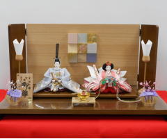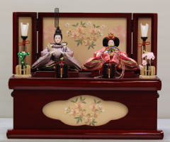 柳サイズの親王揃いを木目に桜金彩蒔絵を配した二曲屏風飾台と組合せたコンパクトな平飾りです。