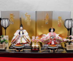 桜刺繍衣装の親王揃いを上ぼかし金紙に金彩蒔絵を施した屏風と組み合わされました。