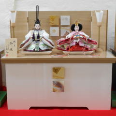 草園作金彩親王揃いを箔ちらしのレリーフを配した木調とホワイト塗装の屏風付き収納飾りと組み合わされました。